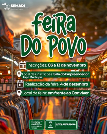 Promovida pela Prefeitura Municipal, por meio da Secretaria de Meio Ambiente e Desenvolvimento Integrado (Semadi), a Feira do Povo será realizada no dia 4 de dezembro, em frente ao Centro de Convivência do Idoso “Aparecida Mourão'.