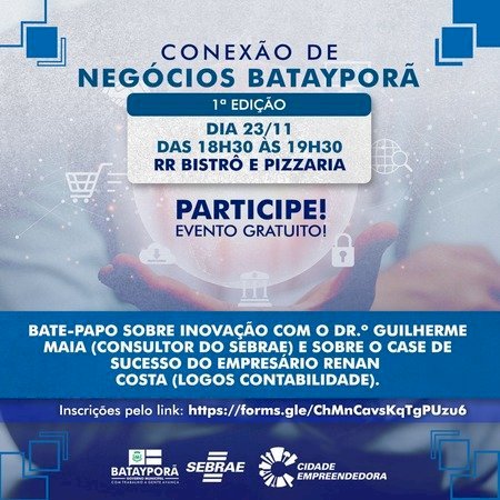 Por meio do programa Cidade Empreendedora, executado pela Prefeitura de Batayporã em parceria com o Sebrae/MS, será realizado no dia 23 de novembro a 1ª Conexão de Negócios. O evento é uma ação do Grupo de Trabalho (GT) voltado a inovação formado por instituições públicas e privadas e pretende fomentar iniciativas inovadoras entre os empreendedores locais. A programação é gratuita e será realizada no RR Bistrô e Pizzaria, das 18h às 19h30. Para participar, basta realizar inscrição pelo link: https://forms.gle/ChMnCavsKqTgPUzu6 .